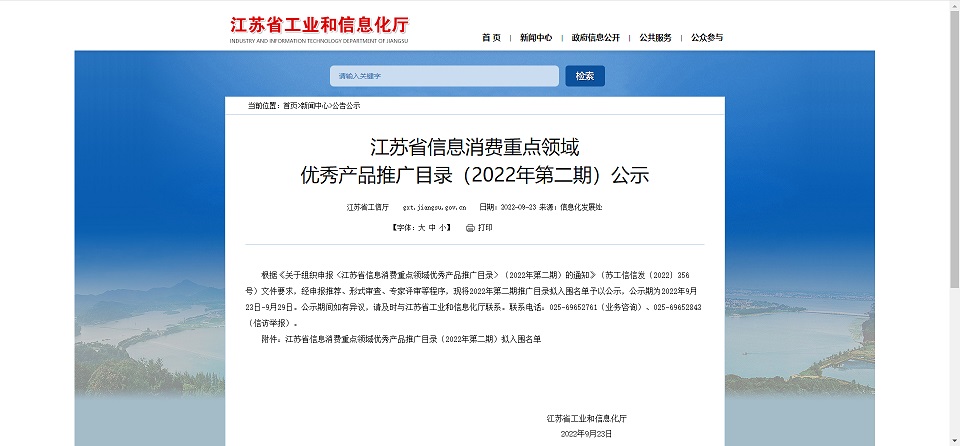 2022年9月,根據(jù)江蘇省工業(yè)和信息化廳官網(wǎng)的公示,公司產(chǎn)品入圍江蘇省信息消費(fèi)重點(diǎn)領(lǐng)域優(yōu)秀產(chǎn)品推廣目錄(2022年第二期)。